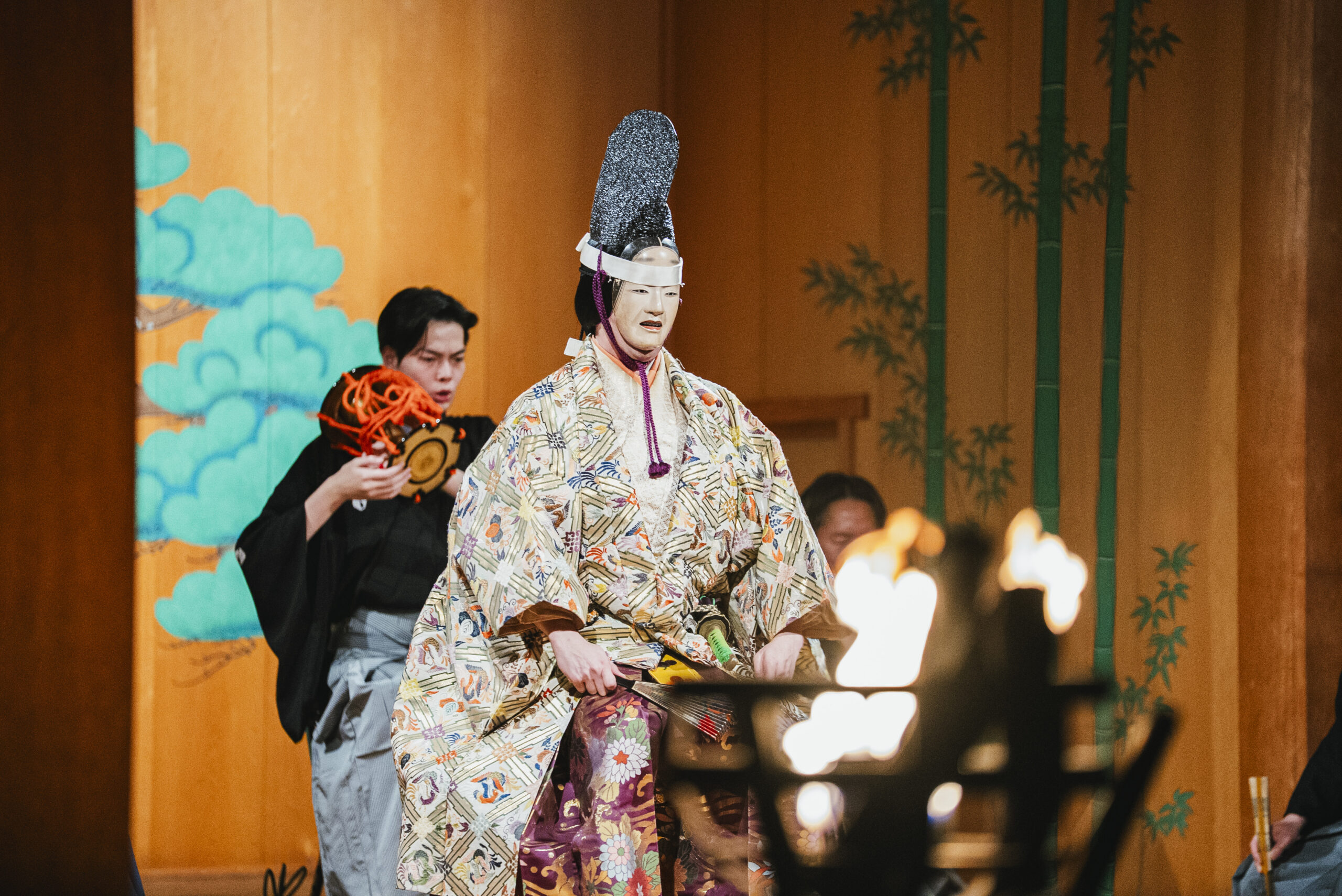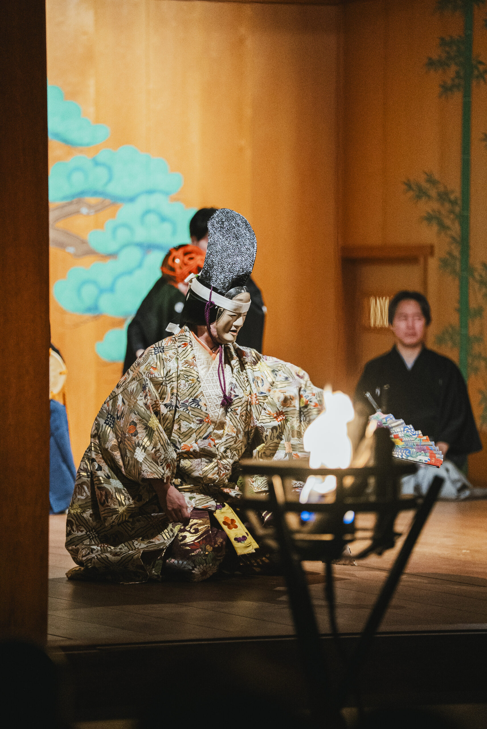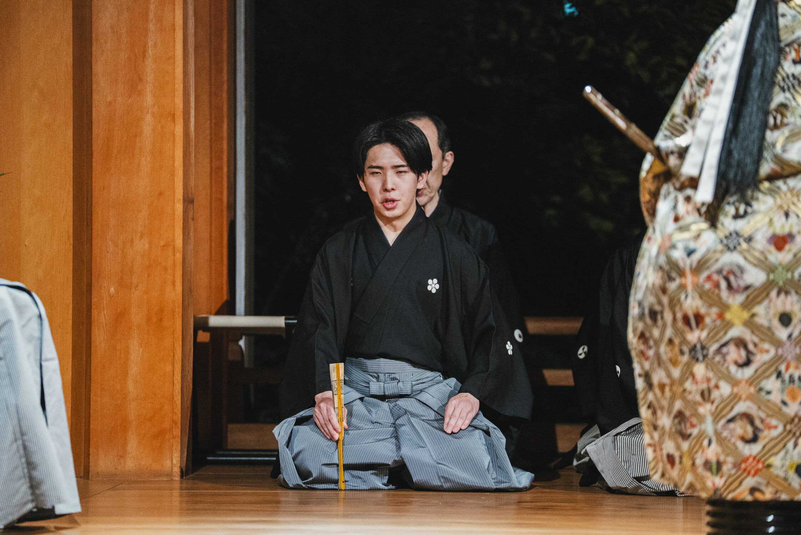 住吉明神が現れ、悪しきを祓い、寿福を招き、千秋万歳を言祝ぐこの舞では、小早川泰輝氏が清らかな所作と真摯な気迫で舞台を引き締めました。若き舞手らしい真面目な一歩一歩の運びに、未来を託したくなるような清々しさが漂っていました。
