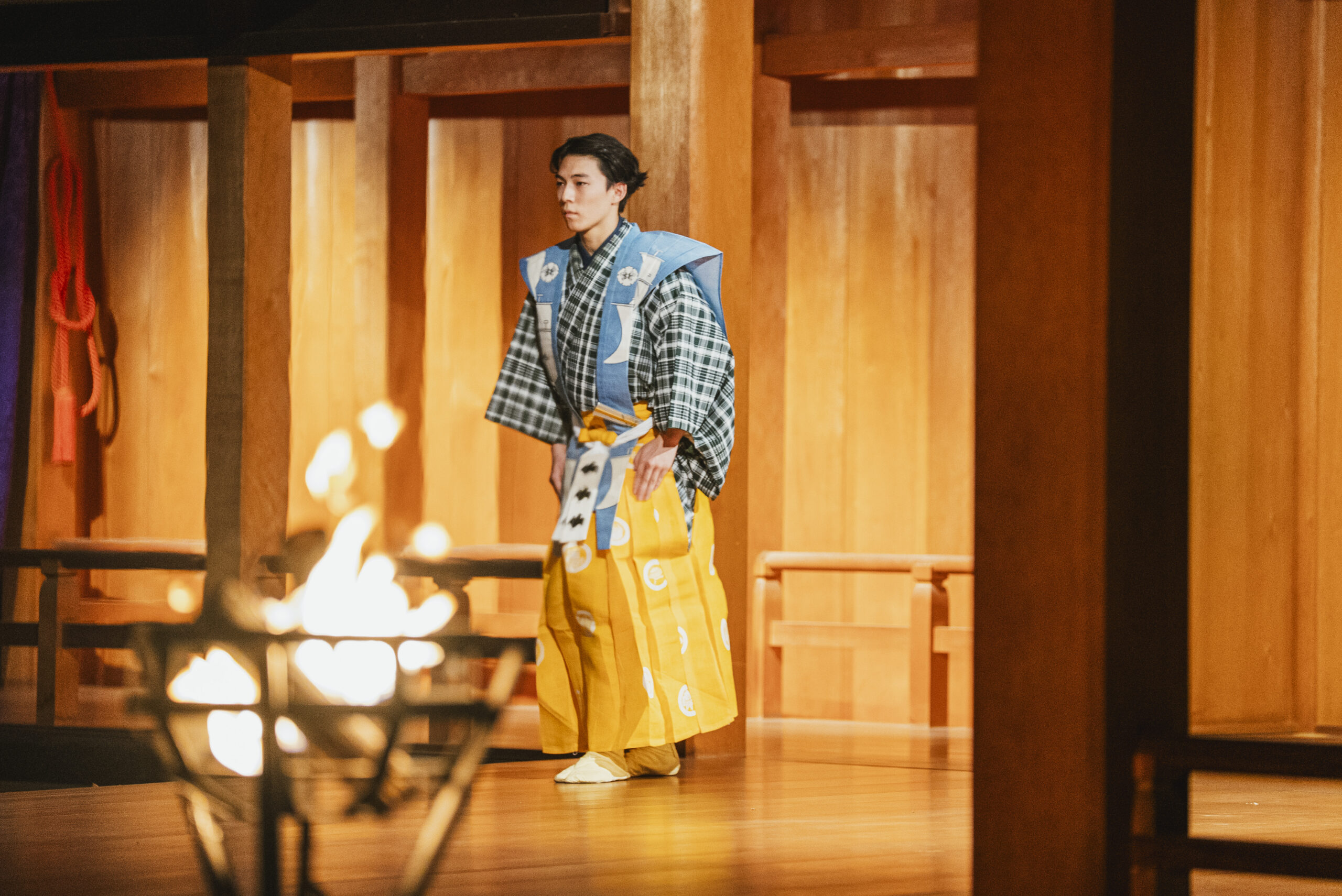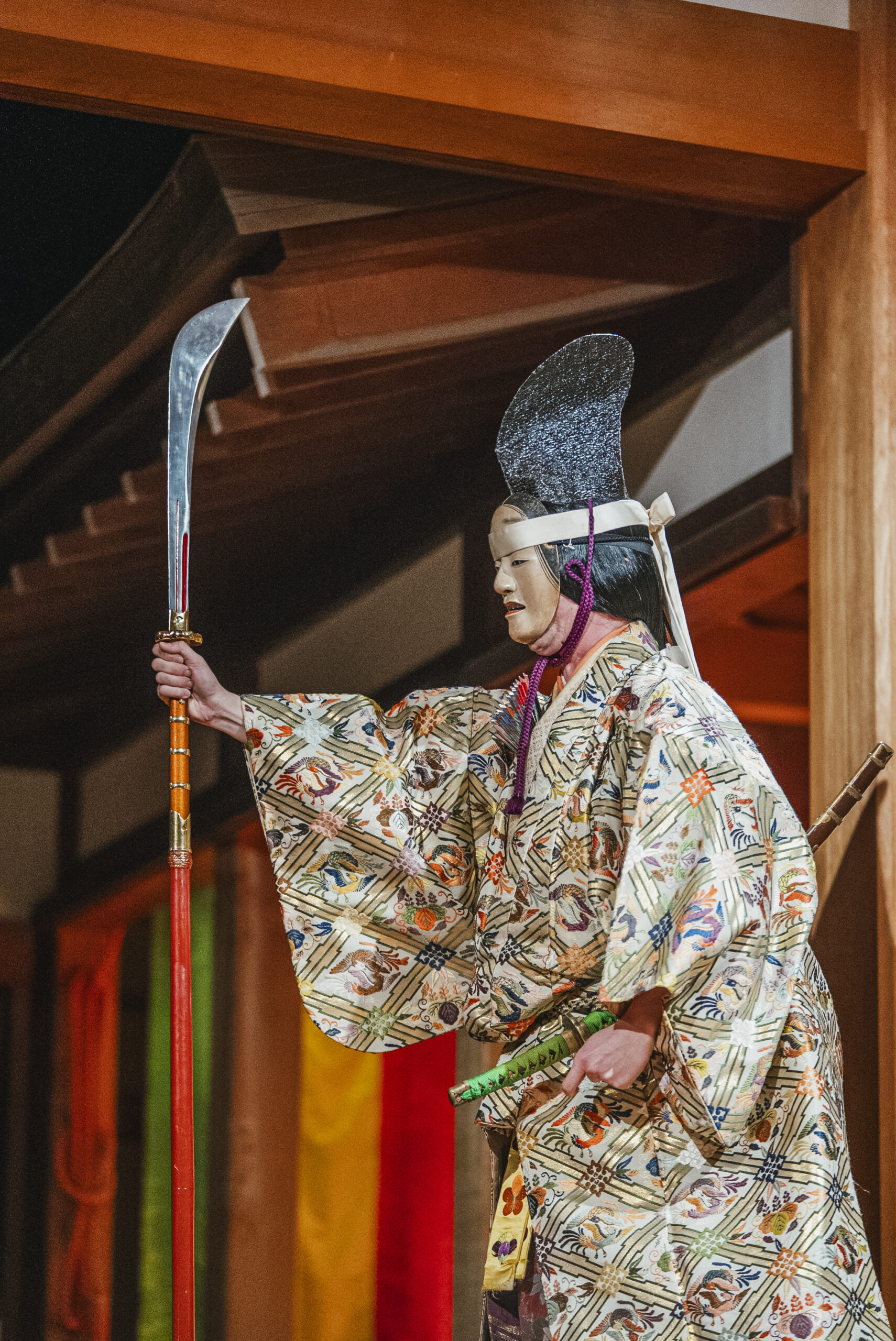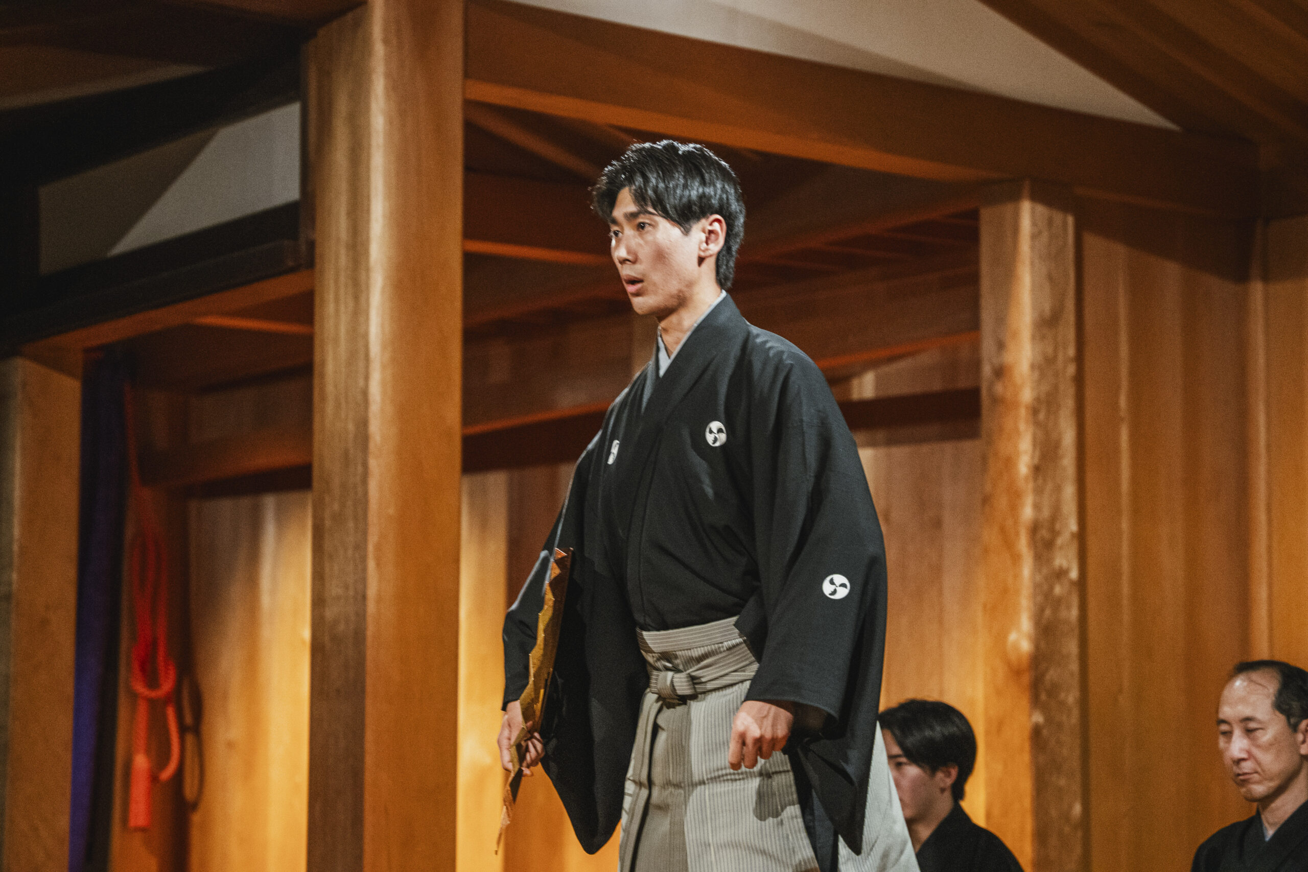 住吉明神が現れ、悪しきを祓い、寿福を招き、千秋万歳を言祝ぐこの舞では、小早川泰輝氏が清らかな所作と真摯な気迫で舞台を引き締めました。若き舞手らしい真面目な一歩一歩の運びに、未来を託したくなるような清々しさが漂っていました。