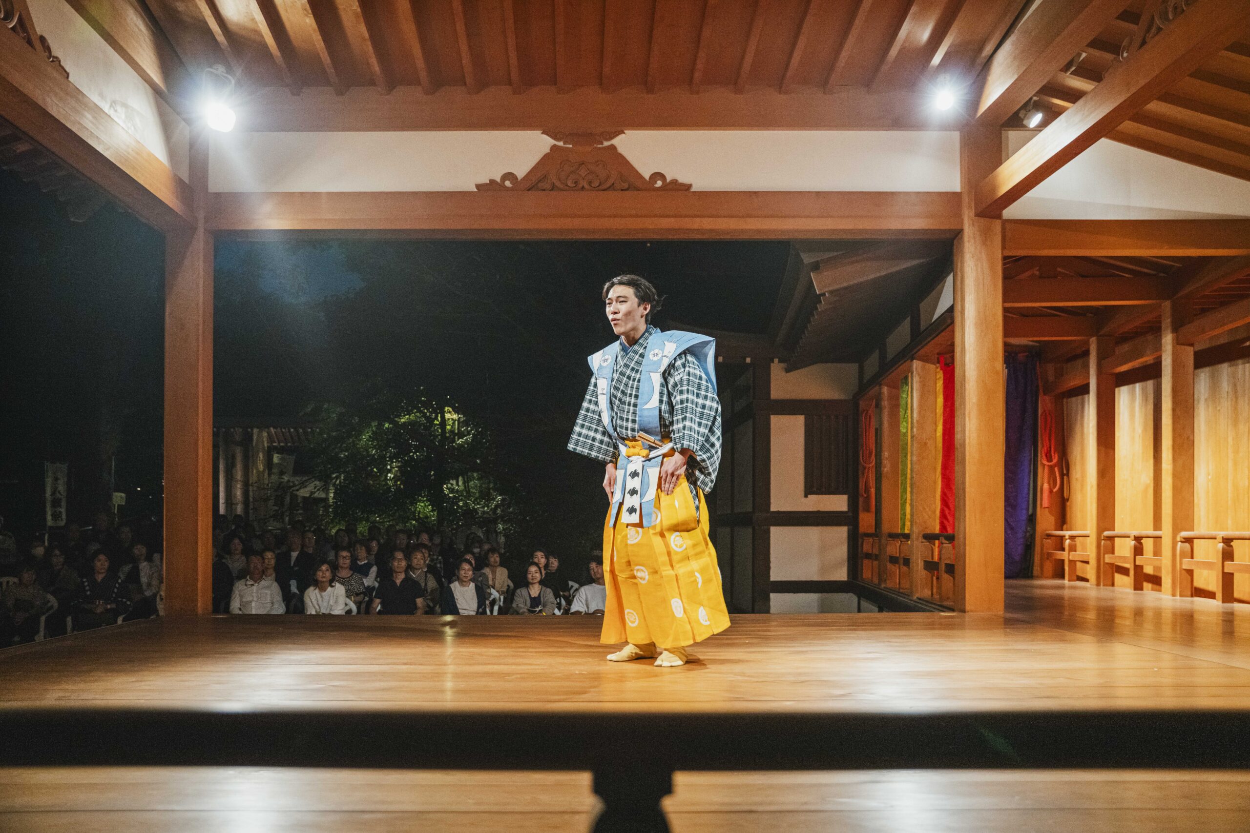 秋分を過ぎた夕刻、神明宮の静謐な神域にて、篝火がゆらめき、舞台に命が宿っていきます。