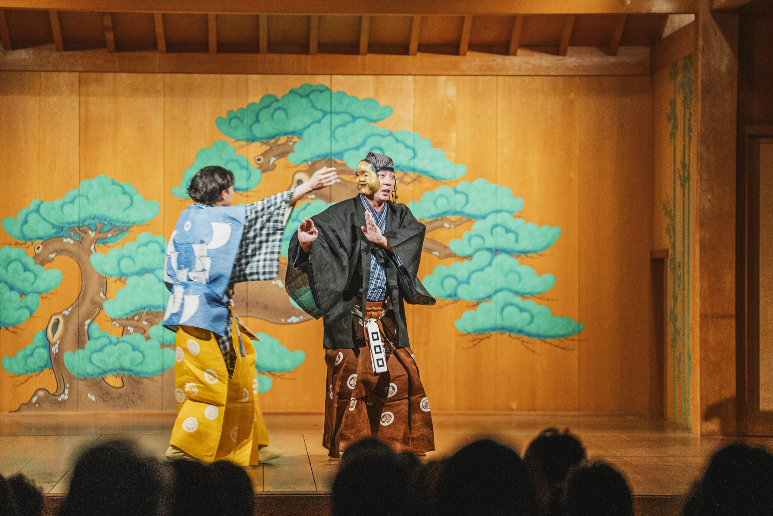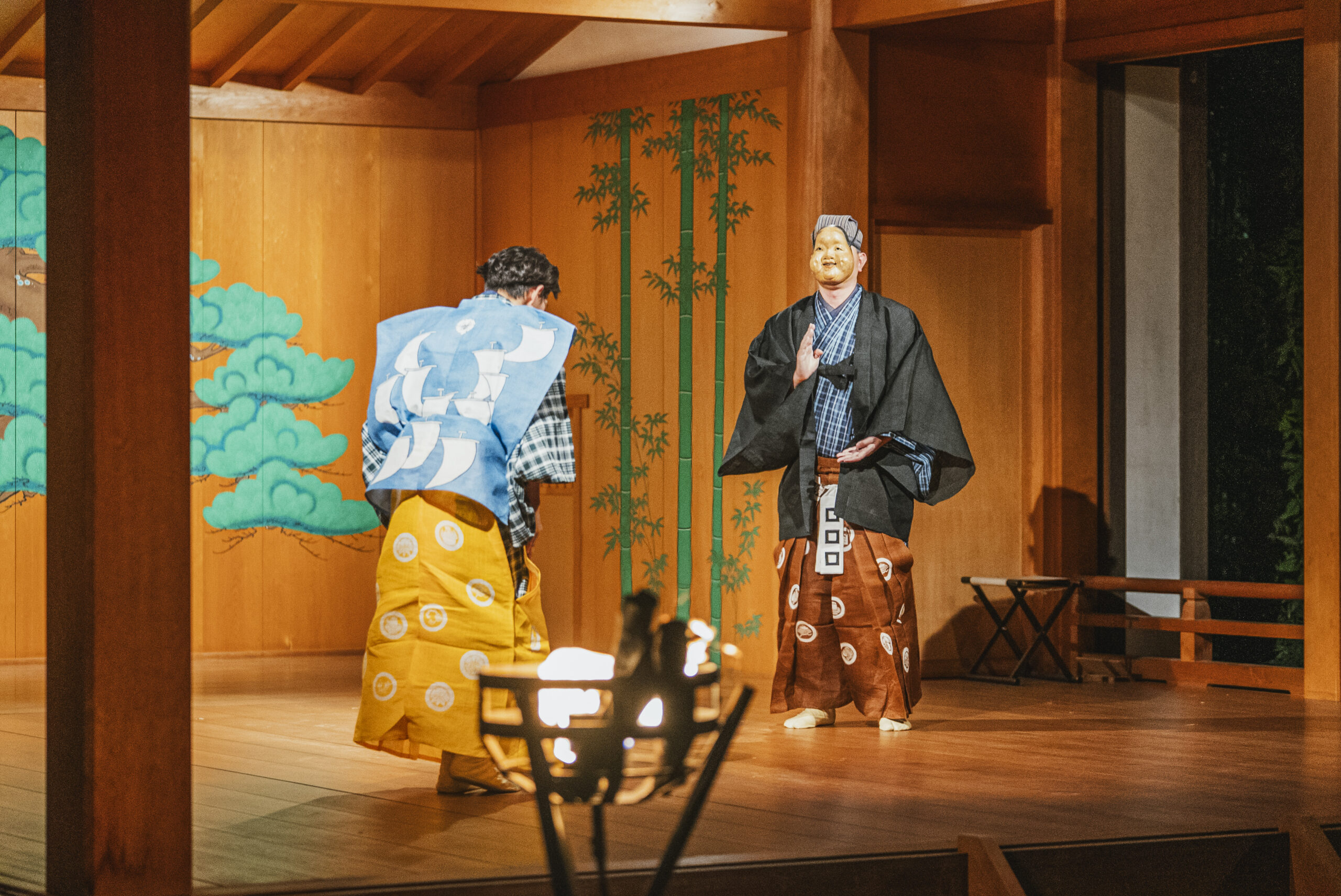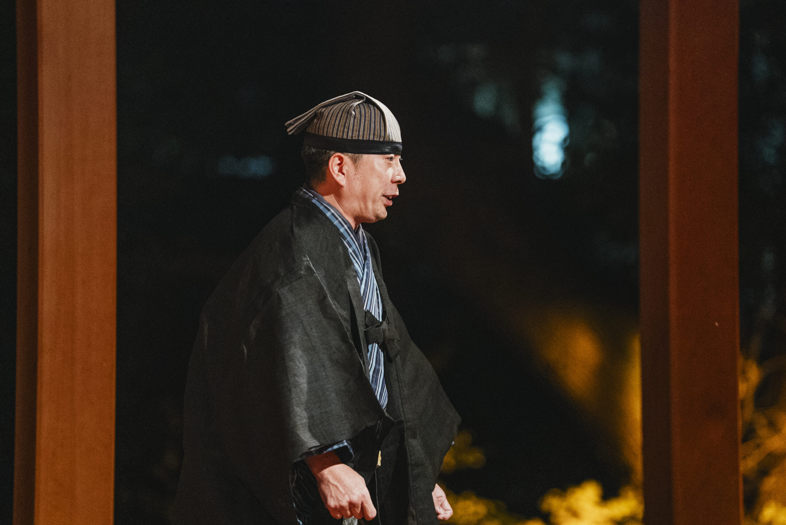 演じるのは、大蔵流狂言方のお二人――シテ(すっぱ・仏師)に大蔵基誠(おおくら・もとなり)氏、アド(田舎者)に大藏康誠(おおくら・やすなり)氏。息の合ったやりとりが、秋の夜の舞台を賑わせました。